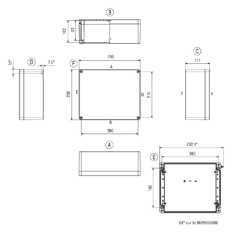 Custodia in metallo per l'utilizzo in applicazioni industriali. I fori per il montaggio sono posti all'esterno dell'area di tenuta stagna. Il montaggio a muro può essere realizzato utilizzando fori di montaggio o piedini di montaggio.