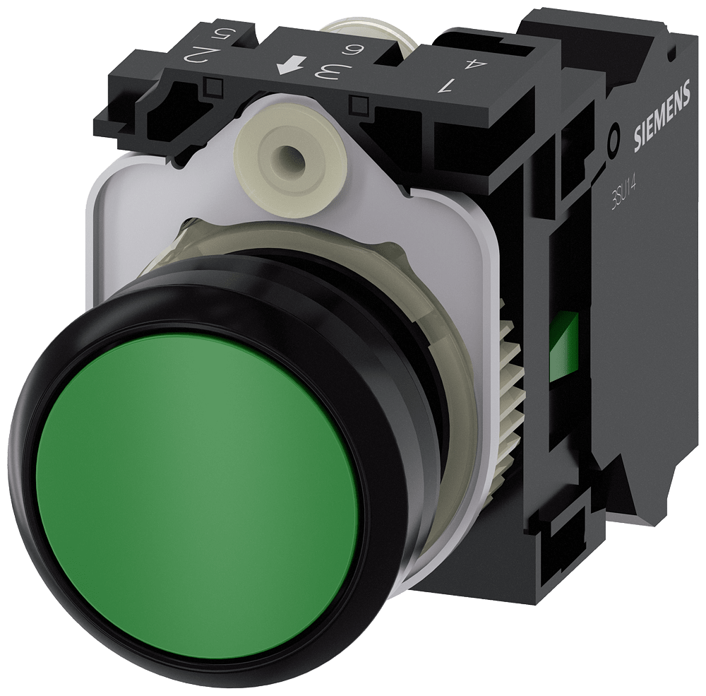 pulsante, 22 mm, rotondo, in plastica, verde, bottone, piatto, ad impulso, con supporto 1 NO, morsetto a molla Pulsante SIRIUS ACT per la commutazione e il comando di utilizzatori elettrici. Siemens offre, sotto il nome commerciale SIRIUS ACT, un portfolio esclusivo di dispositivi di comando e segnalazione con omologazioni di prodotto per il mercato mondiale in tre moderne serie di design in robusto metallo puro e plastica pregiata.Linnovativo concetto di innesto a scatto semplifica talmente il montaggioche per eseguirlo basta una sola mano e non servono attrezzi speciali. Per i fori di montaggio sono sufficienti semplici fori non scanalati, essendo già integrata una protezione antirotazione al 100 %.Grazie al grado di protezione elevato i robusti apparecchi sono adatti allimpiego industriale e in ambiente esterno. È persino possibile la pulizia con getto ad alta pressione. Né polvere, né oli, né liscivia possono comprometterne il funzionamento affidabile.Oltre che con il cablaggio standard, gli apparecchi possono essere collegati al controllore anche tramite PROFINET, AS-Interface oppure IO-Link. Potete così ridurre il vostro onere di cablaggio, minimizzare le fonti di errore e ottenere maggiore flessibilità.Il configuratore online grafico supporta in modo confortevole la scelta e lordinazione di singoli apparecchi, pulsantiere e iscrizioni. È disponibile una documentazione completa (ad es. manuale, dati 3D, schema di collegamento). Esecuzioni fornibili: più colori, luminoso/non luminoso, con/senza iscrizione, comando permanente/ad impulso, diverse altezze di bottone e ghiera. Avvertenza: Apparecchio completo, fornitura incl. supporto e moduli. SIRIUS ACT - Performance in Action nel comando e nella segnalazione. Semplici da montare, altamente performanti, semplicemente perfetti.