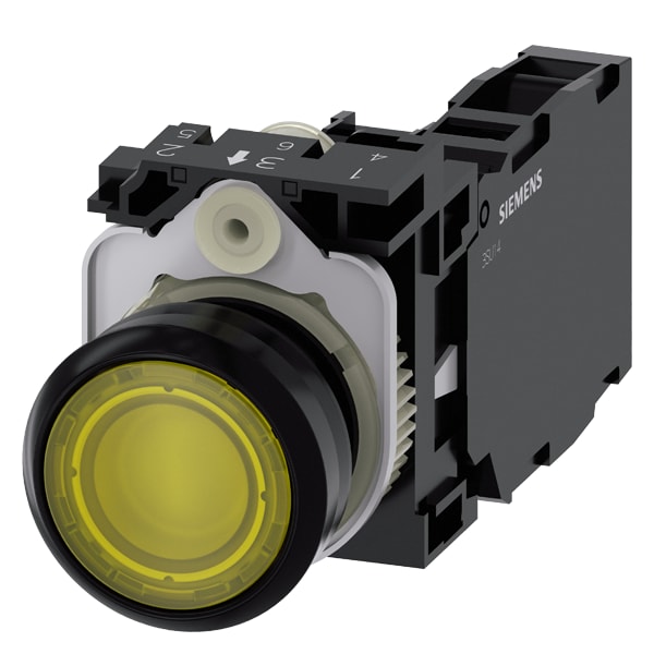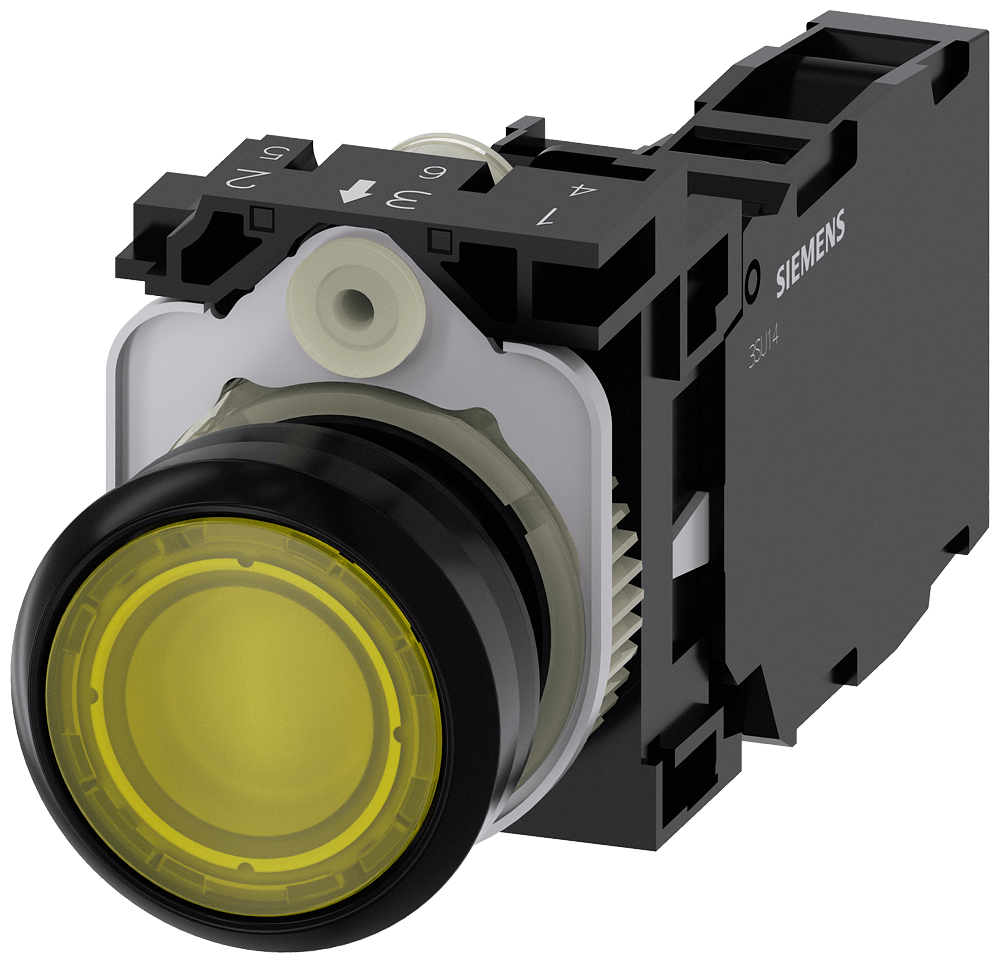 pulsante luminoso, 22 mm, rotondo, in plastica, giallo, bottone, piatto, ad impulso, con supporto, 1 NO+1 NC, modulo LED con LED integrato AC/DC 24V, morsetto a vite Pulsanti luminosi SIRIUS ACT per la commutazione e il comando di utilizzatori elettrici.Siemens offre, sotto il nome commerciale SIRIUS ACT, un portfolio esclusivo di dispositivi di comando e segnalazione con omologazioni di prodotto per il mercato mondiale in tre moderne serie di design in robusto metallo puro e plastica pregiata.Linnovativo concetto di innesto a scatto semplifica talmente il montaggio che per eseguirlo basta una sola mano e non servono attrezzi speciali. Per i fori di montaggio sono sufficienti semplici fori non scanalati, essendo già integrata una protezione antirotazione al 100 %.Grazie al grado di protezione elevato i robusti apparecchi sono adatti allimpiego industriale e in ambiente esterno. È persino possibile la pulizia con getto ad alta pressione. Né polvere, né oli, né liscivia possono comprometterne il funzionamento affidabile.Oltre che con il cablaggio standard, gli apparecchi possono essere collegati al controllore anche tramite PROFINET, AS-Interface oppure IO-Link. Potete così ridurre il vostro onere di cablaggio, minimizzare le fonti di errore e ottenere maggiore flessibilità.Il configuratore online grafico supporta in modo confortevole la scelta e lordinazione di singoli apparecchi, pulsantiere e iscrizioni. È disponibile una documentazione completa (ad es. manuale, dati 3D, schema di collegamento). Esecuzioni fornibili: più colori, luminoso/non luminoso, con/senza iscrizione, comando permanente/ad impulso, diverse altezze di bottone e ghiera. Avvertenza: Apparecchio completo, fornitura incl. supporto e moduli. SIRIUS ACT - Performance in Action nel comando e nella segnalazione. Semplici da montare, altamente performanti, semplicemente perfetti.