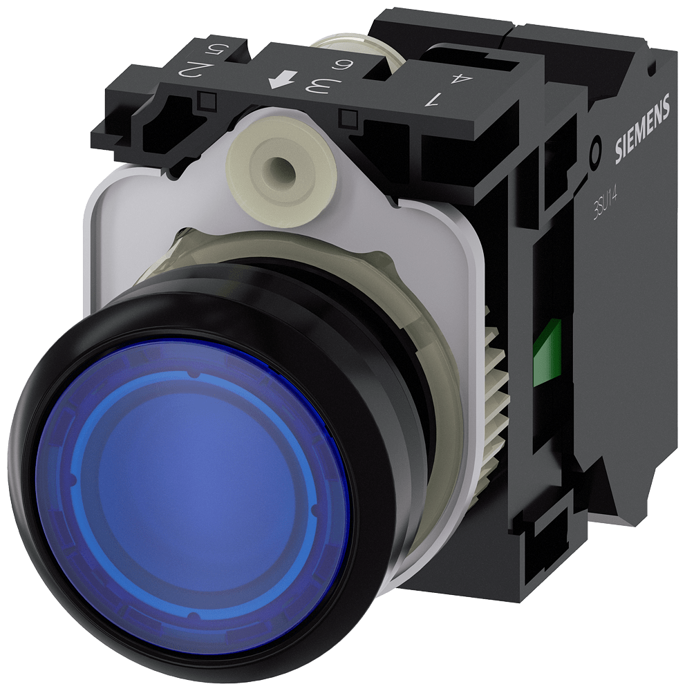 pulsante luminoso, 22 mm, rotondo, in plastica, blu, bottone, piatto, ad impulso, con supporto, 1 NO, modulo LED con LED integrato AC/DC 24V, morsetto a molla Pulsanti luminosi SIRIUS ACT per la commutazione e il comando di utilizzatori elettrici. Siemens offre, sotto il nome commerciale SIRIUS ACT, un portfolio esclusivo di dispositivi di comando e segnalazione con omologazioni di prodotto per il mercato mondiale in tre moderne serie di design in robusto metallo puro e plastica pregiata.Linnovativo concetto di innesto a scatto semplifica talmente il montaggio che per eseguirlo basta una sola mano e non servono attrezzi speciali. Per i fori di montaggio sono sufficienti semplici fori non scanalati, essendo già integrata una protezione antirotazione al 100 %.Grazie al grado di protezione elevato i robusti apparecchi sono adatti allimpiego industriale e in ambiente esterno. È persino possibile la pulizia con getto ad alta pressione. Né polvere, né oli, né liscivia possono comprometterne il funzionamento affidabile.Oltre che con il cablaggio standard, gli apparecchi possono essere collegati al controllore anche tramite PROFINET, AS-Interface oppure IO-Link. Potete così ridurre il vostro onere di cablaggio, minimizzare le fonti di errore e ottenere maggiore flessibilità.Il configuratore online grafico supporta in modo confortevole la scelta e lordinazione di singoli apparecchi, pulsantiere e iscrizioni. È disponibile una documentazione completa (ad es. manuale, dati 3D, schema di collegamento). Esecuzioni fornibili: più colori, luminoso/non luminoso, con/senza iscrizione, comando permanente/ad impulso, diverse altezze di bottone e ghiera. Avvertenza: Apparecchio completo, fornitura incl. supporto e moduli. SIRIUS ACT - Performance in Action nel comando e nella segnalazione. Semplici da montare, altamente performanti, semplicemente perfetti.