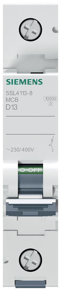interruttore magnetotermico 230/400 V 10 kA, a 1 polo, D, 13A Interruttore magnetotermico SENTRON per la protezione da cortocircuito e sovraccarico sicura per applicazioni standard in edifici residenziali e funzionali. Montaggio e smontaggio dellapparecchio senza attrezzi. Semplice cablaggio dellalimentazione mediante la sbarra collettrice posteriore. Gli interruttori magnetotermici 5SL sono disponibili in esecuzione a 1, 2, 3, 4 poli nonché a 1 polo +N e a 3 poli +N nonché in ulteriori tipi speciali. I numerosi accessori, come ad es. i blocchetti di contatti ausiliari, consentono una varietà di ampliamenti funzionali. Semplicemente sicuri con gli apparecchi di protezione di SENTRON.