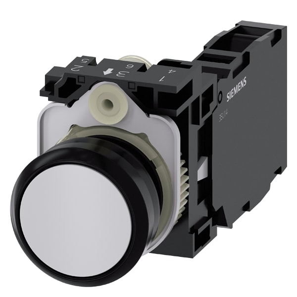 pulsante, 22 mm, rotondo, in plastica, grigio, bottone, piatto, ad impulso, con supporto 1 NO+1 NC, morsetto a vite, Pulsante SIRIUS ACT per la commutazione e il comando di utilizzatori elettrici. Siemens offre, sotto il nome commerciale SIRIUS ACT, un portfolio esclusivo di dispositivi di comando e segnalazione con omologazioni di prodotto per il mercato mondiale in tre moderne serie di design in robusto metallo puro e plastica pregiata.Linnovativo concetto di innesto a scatto semplifica talmente il montaggio che per eseguirlo basta una sola mano e non servono attrezzi speciali. Per i fori di montaggio sono sufficienti semplici fori non scanalati, essendo già integrata una protezione antirotazione al 100 %.Grazie al grado di protezione elevato i robustiapparecchi sono adatti allimpiego industriale e in ambiente esterno. È persino possibile la pulizia con getto ad alta pressione. Né polvere, né oli, né liscivia possono comprometterne il funzionamento affidabile.Oltre che con il cablaggio standard, gli apparecchi possono essere collegati al controllore anche tramite PROFINET, AS-Interface oppure IO-Link. Potete così ridurre il vostro onere di cablaggio, minimizzare le fonti di errore e ottenere maggiore flessibilità.Il configuratore online grafico supporta in modo confortevole la scelta e lordinazione di singoli apparecchi, pulsantiere e iscrizioni. È disponibile una documentazione completa (ad es. manuale, dati 3D, schema di collegamento). Esecuzioni fornibili: più colori, luminoso/non luminoso, con/senza iscrizione, comando permanente/ad impulso, diverse altezze di bottone e ghiera. Avvertenza: Apparecchio completo, fornitura incl. supporto e moduli. SIRIUS ACT - Performance in Action nel comando e nella segnalazione. Semplici da montare, altamente performanti, semplicemente perfetti.