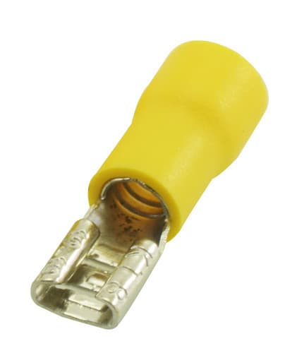 ** Caratteristiche Generali ** Genere: Presa Tipo Connettore: faston 4,8 Colore: Giallo Sezione AWG: AWG 12-10 ** Caratteristiche Elettriche ** Corrente max: 24A ** Caratteristiche Meccaniche ** Materiale Isolamento: PE Materiale Contatto: Ottone Terminazione: a crimpare Sezione conduttori: 4-6mm² Dim. B: 5.8mm Dim. L: 23mm Dim. H: 14mm Dim. DØ: 5.7mm Dim. dØ: 3.4mm Dim. S: 0.5mm