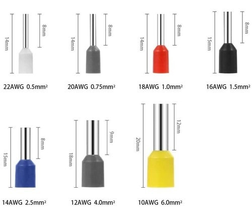 Pratica scatoletta con otto scomparti di puntalini capicorda a bussola per cavi da 0,5 a 6,0mm².La confezione contiene:22-60-010 bianco - 0,5mm² - 22AWG - 100pz22-60-012 grigio - 0,75mm² - 20AWG - 100pz22-60-014 rosso - 1,0mm² - 18AWG - 50pz22-60-016 nero - 1,5mm² - 16AWG - 50pz22-60-018 blu - 2,5mm² - 14AWG - 50+50pz22-60-020 grigio - 4,0mm² - 12AWG - 25pz22-60-022 giallo - 6,0mm² - 10AWG - 25pzTotale: 450 pezzi