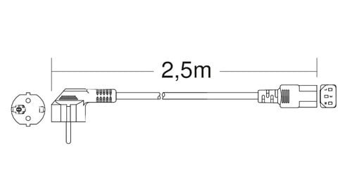 ** Caratteristiche **Colore cavo: NeroLunghezza Cavo: 2.5mFormazione cavo: 3 x 0.75mm²Tipo Cavo: TondoPortata: 10ATensione massima: 250VNome tecnico: H05W-F** Connettore A **Tipo Connettore A: Spina Schuko 90°** Connettore B **Tipo Connettore B: Presa IEC320 C13 Dritto