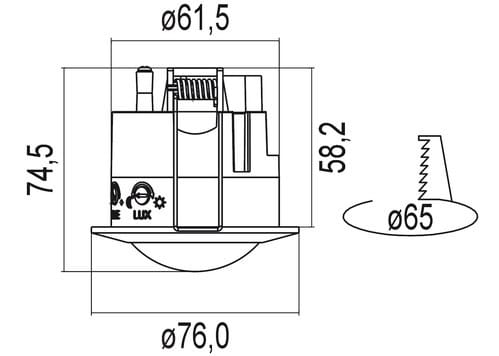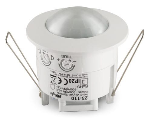 ** Caratteristiche Generali **Principio di funzionamento: InfrarossiColore: Bianco** Caratteristiche Elettriche **TipoTensione: acTens. funzionamento AC: 230VacTolleranza d'ingresso: ±10%Frequenza: 50-60HzConsumo energetico stand-by: 0.1WConsumo energetico operativo: 0.45W** Caratteristiche dei contatti **Potenza massima carico capacitivo: 300WPotenza massima carico resistivo: 1200W** Installazione **Luogo d'impiego: InternoMontaggio: SoffittoAltezza d'installazione: 2.2 - 4mCampo di rilevamento: 360°Range max di movimento: 6m** Caratteristiche Meccaniche **Dimensioni (LxWxH): 76 x 76 x 75.6mmGrado di protezione: IP20** Regolazioni **Periodo di accensione: 10s - 15minLivello di luminosità: 3 - 2000lux** Caratteristiche Termiche **Temp. di funzionamento: -10 / 40°CDiametro foro incasso: 65mm