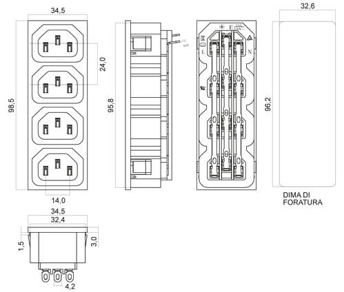 ** Caratteristiche Generali ** Genere: Presa Norma di riferimento: EN 60320 Foglio tecnico: C13 Colore: Nero Orientamento: Dritto ** Caratteristiche Elettriche ** Corrente max: 10A Tensione max: 250V ** Caratteristiche Meccaniche ** Materiale Corpo: Termoplastico rinforzato con fibra di vetro Materiale Contatto: Lega di rame Tipo contatto: faston 4.8mm Terminazione: a saldare Montaggio connettore: pannello Foro fissaggio: 32.6mm x 96.2mm ** Caratteristiche Termiche ** Temperatura di lavoro: 0/70°C
