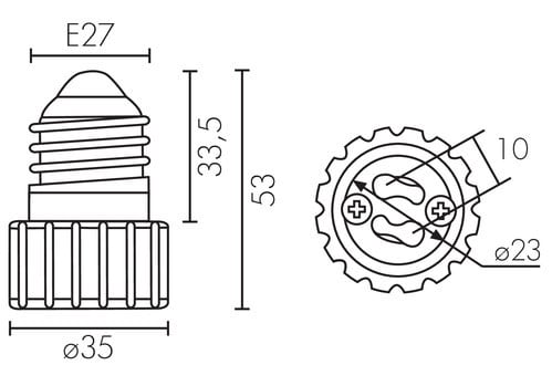 ** Caratteristiche Generali **Attacco A: Maschio E27Attacco B: Femmina GU10** Caratteristiche Elettriche **Tensione max: 240VCorrente max: 2A** Caratteristiche Meccaniche **Materiale corpo: Plastico** Caratteristiche Termiche **Temp. di funzionamento: 0 / 35°C