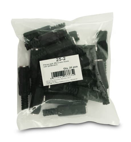 ** Caratteristiche Generali **Genere: PresaTipo Connettore: JackColore: NeroOrientamento: DrittoNr. Poli: 2Canali: Mono** Caratteristiche Meccaniche **Materiale Corpo: PVCMateriale Contatto: Ottone nichelatoTipo contatto: a saldareMontaggio connettore: volanteDiametro Pin: 2.5mm