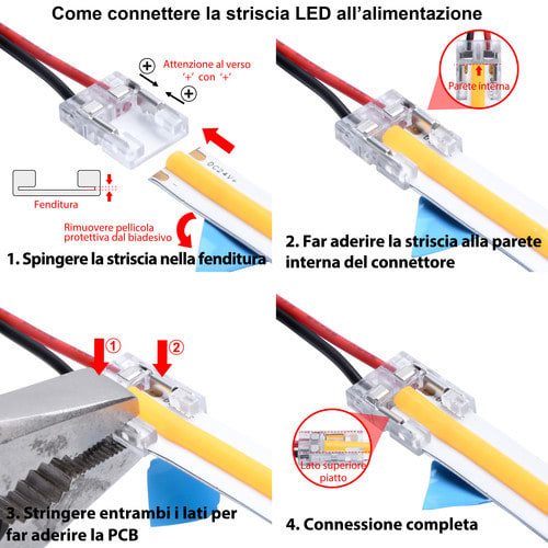 ** Caratteristiche Generali ** Adatto per tipo di Led: COB, SMD Adatto per striscia: Monocolore Larghezza nastro: 10mm Tipo connettore: Connettore con cavetto Lunghezza cavo: 15cm Sezione AWG: 20AWG N. Poli: 2 ** Caratteristiche Elettriche ** Tens. funzionamento DC: 3‑24Vdc Corrente max: 3.5A ** Caratteristiche Meccaniche ** Lunghezza: 15.6mm Larghezza: 11.6mm Altezza: 3.3mm Grado di protezione: IP20 Tipo contatto: a crimpare