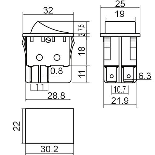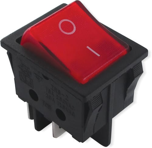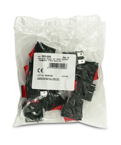 ** Caratteristiche Generali **Attuatore: BilanciereSerigrafia: I/OLuminoso: noColore: RossoMateriale attuatore: PlasticaTipi contatti: DPSTPortata: 15A@250Vac, 20A@125VacN. poli: 2Stato dei contatti: ON/OFFTipo terminale: faston 6,3N. terminali: 4Montaggio: Pannello a incastroForo fissaggio: 22mm x 30.2mm