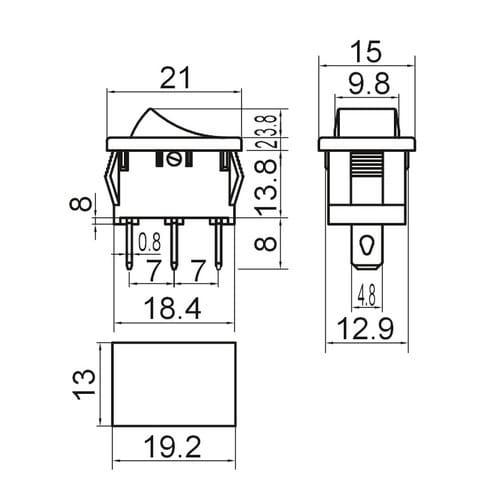 ** Caratteristiche Generali **Attuatore: BilanciereSerie: MiniaturaSerigrafia: NessunaLuminoso: noColore: NeroMateriale attuatore: PlasticaTipi contatti: SPDTPortata: 6A@250Vac, 10A@125VacN. poli: 1Stato dei contatti: ON/ONTipo terminale: faston 4,8N. terminali: 3Montaggio: Pannello a incastroForo fissaggio: 13mm x 19.2mm
