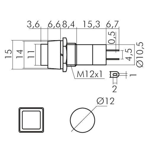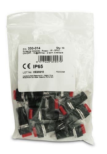 ** Caratteristiche Generali **Attuatore: PulsanteSerigrafia: NessunaLuminoso: noColore: RossoMateriale attuatore: PlasticaTipi contatti: SPSTPortata: 1A@250Vac, 3A@125VacN. poli: 1Stato dei contatti: ON/OFFTipo terminale: a saldareN. terminali: 2Montaggio: Pannello con dadoForo fissaggio: ø12mm