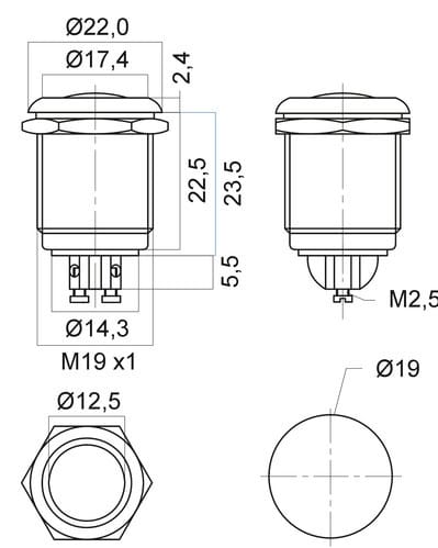 ** Caratteristiche Generali **Attuatore: Pulsante antivandaloSerie: AntivandaloSerigrafia: NessunaLuminoso: noColore: MetalloMateriale attuatore: Ottone nichelatoTipi contatti: SPSTPortata: 2A@250Vac, 4A@125VacN. poli: 1Stato dei contatti: OFF/(ON) - N.A.Tipo terminale: viteN. terminali: 2Montaggio: Pannello con dadoForo fissaggio: ø19mmNote aggiuntive: antivandalo rientrato, waterproofGrado di protezione: IP66Temperatura di lavoro: -20 / 55°C