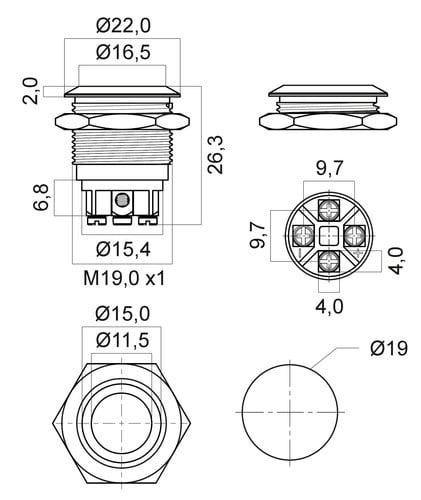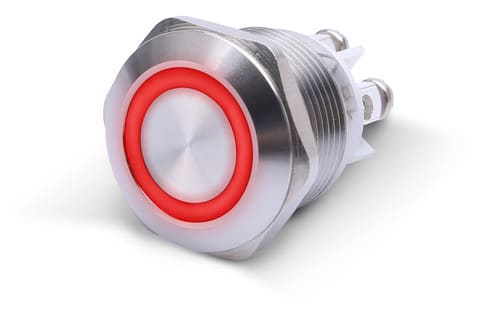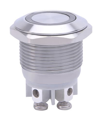 ** Caratteristiche Generali **Attuatore: Pulsante antivandaloSerie: AntivandaloForma dell'attuatore: ConvessoSerigrafia: NessunaLuminoso: siColore illuminazione: RossoTensione illuminazione: 24Vac/dcColore: MetalloMateriale attuatore: AcciaioTipi contatti: SPSTPortata: 5A@250Vac, 5A@125VacN. poli: 1Stato dei contatti: OFF/(ON) - N.A.Tipo terminale: viteN. terminali: 4Montaggio: Pannello con dadoForo fissaggio: ø19mmGrado di protezione: IP65Temperatura di lavoro: -20 / 55°C
