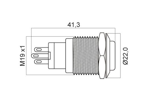 ** Caratteristiche Generali **Attuatore: Pulsante antivandaloSerie: AntivandaloForma dell'attuatore: In rilievoLuminoso: siColore illuminazione: BluTensione illuminazione: 24Vac/dcColore: LucidoMateriale attuatore: AcciaioTipi contatti: SPDTPortata: 5A@250Vac, 5A@36VdcN. poli: 1Stato dei contatti: ON/ONTipo terminale: a saldareN. terminali: 5Montaggio: Pannello con dadoForo fissaggio: ø19mmGrado di protezione: IP65Temperatura di lavoro: -10 / 40°C