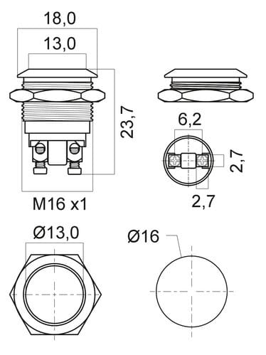 ** Caratteristiche Generali **Attuatore: Pulsante antivandaloSerie: AntivandaloForma dell'attuatore: PiattoSerigrafia: NessunaLuminoso: noColore: MetalloMateriale attuatore: AcciaioTipi contatti: SPSTPortata: 2A@250Vac, 3A@125VacN. poli: 1Stato dei contatti: OFF/(ON) - N.A.Tipo terminale: viteN. terminali: 2Montaggio: Pannello con dadoForo fissaggio: ø16mmGrado di protezione: IP65Temperatura di lavoro: -20 / 55°C