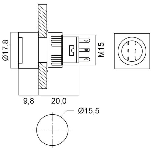 ** Caratteristiche Generali ** Attuatore: Pulsante Forma dell'attuatore: Piatto Serigrafia: Nessuna Luminoso: no Colore: Verde Materiale attuatore: Plastica Tipi contatti: DPDT Portata: 3A@250Vac N. poli: 2 Stato dei contatti: (ON)/ON Tipo terminale: a saldare N. terminali: 6 Montaggio: Pannello con dado Foro fissaggio: ø15.5mm Grado di protezione: IP40