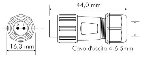 ** Caratteristiche Generali **Genere: SpinaOrientamento: DrittoNr. Poli: 2Serie Fornitore: SP11** Caratteristiche Elettriche **Corrente max: 5ATensione max: 180V** Caratteristiche Meccaniche **Materiale Corpo: NylonMateriale Contatto: Lega dirame dorataTipo contatto: a saldareTerminazione: a saldareMontaggio connettore: volanteSezione conduttori: 0-0.79mm²Diametro cavo min: 4mmDiametro cavo max: 6.5mmGrado di protezione: IP68** Caratteristiche Termiche **Temperatura di lavoro: -25/80°C