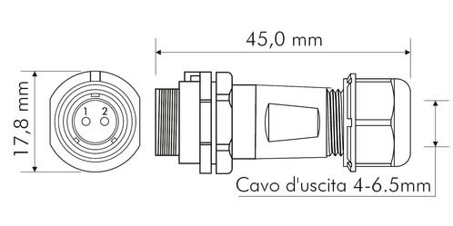 ** Caratteristiche Generali **Genere: PresaOrientamento: DrittoNr. Poli: 2Serie Fornitore: SP11** Caratteristiche Elettriche **Corrente max: 5ATensione max: 180V** Caratteristiche Meccaniche **Materiale Corpo: NylonMateriale Contatto: Lega dirame dorataTipo contatto: a saldareMontaggio connettore: volanteSezione conduttori: 0-0.79mm²Diametro cavo min: 4mmDiametro cavo max: 6.5mmGrado di protezione: IP68** Caratteristiche Termiche **Temperatura di lavoro: -25/80°C