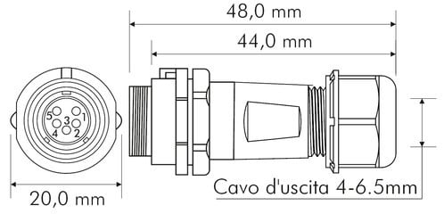 ** Caratteristiche Generali **Genere: PresaOrientamento: DrittoNr. Poli: 5Serie Fornitore: SP13** Caratteristiche Elettriche **Corrente max: 5ATensione max: 250V** Caratteristiche Meccaniche **Materiale Corpo: NylonMateriale Contatto: Lega dirame dorataTipo contatto: a saldareMontaggio connettore: volanteSezione conduttori: 0-2mm²Diametro cavo min: 4mmDiametro cavo max: 6.5mmGrado di protezione: IP68** Caratteristiche Termiche **Temperatura di lavoro: -25/80°C