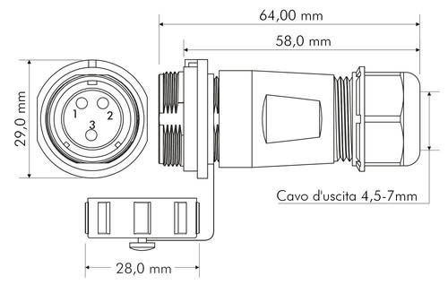 ** Caratteristiche Generali **Genere: PresaOrientamento: DrittoNr. Poli: 3Serie Fornitore: SP21** Caratteristiche Elettriche **Corrente max: 30ATensione max: 500V** Caratteristiche Meccaniche **Materiale Corpo: NylonMateriale Contatto: Lega di rame dorataTipo contatto: a saldareMontaggio connettore: volanteSezione conduttori: 0-4mm²Diametro cavo min: 4.5mmDiametro cavo max: 7mmGrado di protezione: IP68** Caratteristiche Termiche **Temperatura di lavoro: -25/80°C
