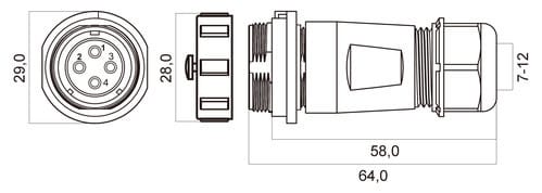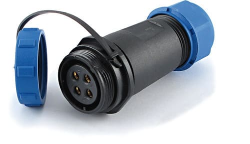 ** Caratteristiche Generali **Genere: PresaOrientamento: DrittoNr. Poli: 4Serie Fornitore: SP21** Caratteristiche Elettriche **Corrente max: 30ATensione max: 500V** Caratteristiche Meccaniche **Materiale Corpo: NylonMateriale Contatto: Lega di rame dorataTipo contatto: a saldareMontaggio connettore: volanteSezione conduttori: 4mm²Diametro cavo min: 4.5mmDiametro cavo max: 7mmGrado di protezione: IP68** Caratteristiche Termiche **Temperatura di lavoro: -25/80°C