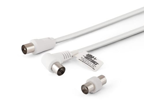 ** Caratteristiche ** Colore cavo: Bianco Lunghezza Cavo: 3m Diametro cavo: ø5mm Tipo Cavo: Lineare, Tondo Guaina cavo: PVC Schermatura: Calza + foglio Materiale conduttori: Rame Puro Corpo connettori: Plastico Finitura contatto : Nichelato ** Connettore A ** Tipo Connettore A: Spina TV Coax ø9.5mm ** Connettore B ** Tipo Connettore B: Presa TV Coax ø9.5mm 90°