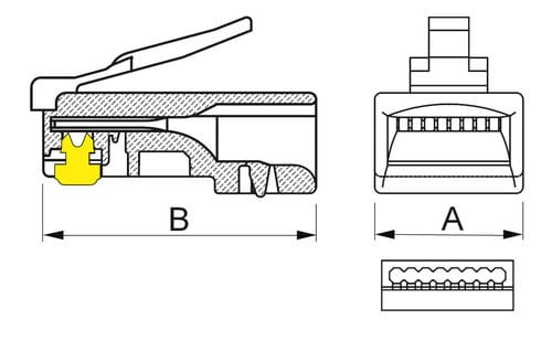 ** Caratteristiche Generali **Genere: SpinaCategoria: CAT.5eColore: TrasparenteNr. Poli: 8Configurazione Poli: 8P8CAdatto per tipo conduttore: Trefolo + RigidoSezione AWG: AWG24-26Tipo Clip: Standard** Caratteristiche Elettriche **Schermatura:noTipo Schermatura: U/UTP** Caratteristiche Meccaniche **Materiale Corpo: PC UL 94V-2Materiale Contatto: Bronzo fosforosoPlaccatura contatti: Contatti doratiDiametro conduttori max: 1mmDiametro cavo max: 6mmInserti: 0Placcatura: 50µmFormato Corpo: StandardDim. A: 11.68mmDim. B: 21.48mm** Caratteristiche Termiche **Classe di infiammabilità: UL94V-2