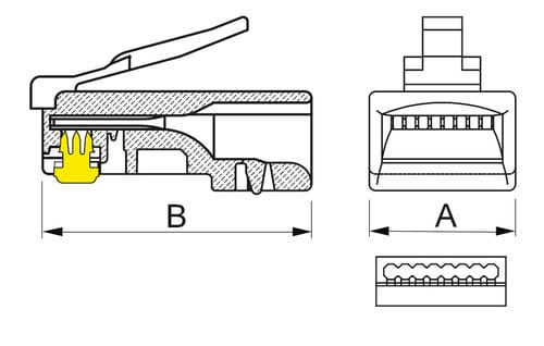 ** Caratteristiche Generali **Genere: SpinaCategoria: CAT.5eColore: TrasparenteNr. Poli: 8Configurazione Poli: 8P8CAdatto per tipo conduttore: RigidoSezione AWG: AWG24-26Tipo Clip: Standard** Caratteristiche Elettriche **Schermatura: noTipo Schermatura: U/UTP** Caratteristiche Meccaniche **Materiale Corpo: PC UL 94V-2Materiale Contatto: Bronzo fosforosoPlaccatura contatti: Contatti doratiDiametro cavo max: 6mmInserti: 1Placcatura: 50µmFormato Corpo: StandardDim. A: 11.68mmDim. B: 21.48mm** Caratteristiche Termiche **Classe di infiammabilità: UL94V-2
