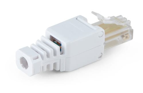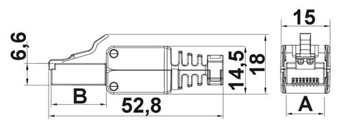 La spina non necessita dell'impiego di utensili e consente di eseguire cablaggi rapidi ed efficienti. Ideali per realizzare bretelle di collegamento con lunghezze fuori standard.** Caratteristiche Generali **Genere: SpinaCategoria: CAT.5eColore: GrigioNr. Poli: 8Configurazione Poli: 8P8CAdatto per tipo conduttore: RigidoSezione AWG: AWG22-26Tipo Clip: Standard** Caratteristiche Elettriche **Schermatura: no** Caratteristiche Meccaniche **Materiale Corpo: PC UL 94V-2Materiale Contatto: Bronzo fosforosoPlaccatura contatti: Contatti doratiTipo contatto: perforazioneMontaggio connettore: volanteDiametro cavo max: 6mmInserti: 0Dim. A: 11.6mmDim. B: 16.7mmDiametro cavi supportati: da 6mm