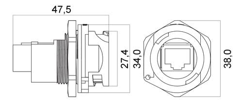 ** Caratteristiche Generali **Genere: PresaCategoria: CAT.5eColore: NeroOrientamento: Dritto** Caratteristiche Elettriche **Schermatura: si** Caratteristiche Meccaniche **Materiale Corpo: PCMateriale Contatto: Lega di rameMontaggio connettore: pannelloGrado di protezione: IP67Foro incasso: ø25.7mm