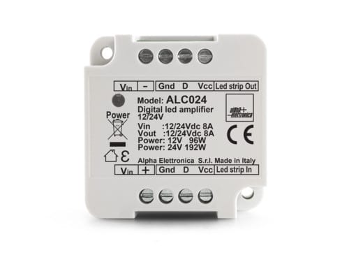 Grazie all'amplificatore per strisce led digitali ALC024 potrai creare effetti di luce lineari con accensione e spegnimento progressivi comandati dal controller master ALC244 con lunghezza superiore a 5m.** Caratteristiche elettriche **Vin: 12/24Vdc 8AVout: 12/24Vdc 8APower: 12V 96WPower: 24V 192W** Caratteristiche Generali **Funzione: AmplificatoreAdatto per: Monocolore** Caratteristiche Elettriche **Tipo regolazione: Tensione costante (CV)Tensione d'ingresso: 12/24VTensione d'uscita: come ingressoTipo di uscita: morsettiCorrente/Ch: 8An. canali: 1Potenza nominale (12V): 96WPotenza nominale (24V): 192W** Caratteristiche Meccaniche **Lunghezza: 48.8mmLarghezza: 48.8mmAltezza: 24mmGrado di protezione: IP20Materiale corpo: PlasticaColore corpo: Bianco** Caratteristiche Termiche **Temp. di funzionamento: -10 / 40°C