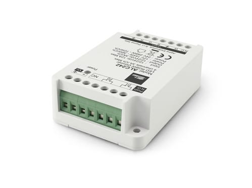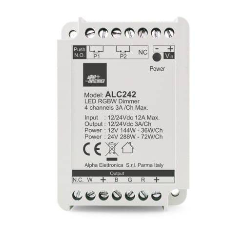 Caratteristiche generaliController RGBW per strisce led e sorgenti led resistive a tensione costante 12V oppure 24V. Il controllo dell'intensità luminosa e delle funzioni viene eseguito tramite pulsanti generici opportunamente installati ai morsetti P1(Bianco) e P2(RGB). Pulsanti non forniti. Il dispositivo mantiene memoria dell'ultimo modo di funzionamento impostato anche dopo aver spento e riacceso l'alimentazione.** Caratteristiche Generali **Funzione: ControllerAdatto per: RGBWMetodo di controllo: Pulsante** Caratteristiche Elettriche **Tipo regolazione: Tensione costante (CV)Tensione d'ingresso: 12/24VTensione d'uscita: come ingressoTipo di uscita: morsettiMetodo di connessione: anodo comuneCorrente/Ch: 3An. canali: 4Potenza nominale (12V): 144WPotenza nominale (24V): 288W** Caratteristiche Meccaniche **Lunghezza: 76mmLarghezza: 52.5mmAltezza: 24.5mmGrado di protezione: IP20Materiale corpo: PlasticaColore corpo: Bianco** Caratteristiche Termiche **Temp. di funzionamento: -10 / 40°CModalità di utilizzoLa striscia led RGB o RGBW collegata all'uscita del controller ALC242 può essere accesa o spenta tramite pressione dei due pulsanti.Il pulsante P1 controlla il canale Bianco del dimmer:- La pressione breveaccende e spegne il canale Bianco- La pressione lunga mentre il carico è acceso fa variare l'intensità luminosa del canale Bianco- La pressione lunga da spento imposta la modalità "Luce di cortesia", la luce viene accesa con intensità al 10%Il pulsante P2 controlla i canali RGB, con due modalità di funzionamento:- Luce colorata con rotazione colori- Luce colorata fissaE' possibile cambiare la modalità tramite doppio click del pulsante P2.La pressione lunga del pulsante ha funzione differente a seconda della modalità o dello stato in cui si trova il controller ALC242:- Se in "Luce colorata con rotazione colori", viene variata la velocità di rotazione- Se in "Luce colorata fissa"viene variata l’intensità della luceAd ogni pressione prolungata del tasto viene invertita la direzione di variazione della velocità o dell’intensità.ProtezioniSovratemperatura, Inversione di polarità, Sovraccarico, Cortocircuito in uscitaNoteL’installazione deve essere eseguita solamente da personale qualificato. Si consiglia di installare un fusibile adeguato in ingresso al dispositivo. L’alimentatore dovrà essere scelto in funzione del carico led collegato per tensione e corrente. Utilizzare un alimentatore con potenza nominale maggiore rispetto al carico da alimentare (circa 30%).