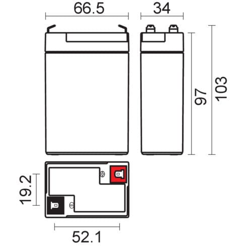 ** Caratteristiche Generali **Adatto per: UPSTecnologia: Piombo AGM** Caratteristiche Elettriche **Tensione: 6VCapacità: 3.2Ah** Caratteristiche Meccaniche **Dimensioni: 34mm x 66.5mm x 103mmPeso: 0.52KgConnessioni: faston 4.8mm