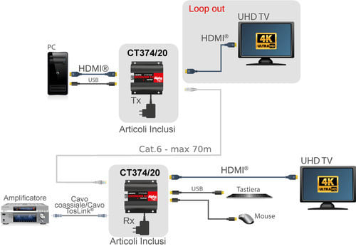 L'extender CT374/20 é adatto per estendere la lunghezza dei cavi HDMI utilizzando un solo cavo Cat.6. In questo modo è possibile la trasmissione a distanze notevoli senza degradazione di segnale. E' la soluzione ideale per uso domestico e show rooms, applicazioni legate alla sicurezza, sale conferenza, scuole e ambienti di training.** Specifiche **- Coppia di moduli plug-and-play, TX + RX- Estensione su singolo cavo CAT.6/6A/7 IEEE-568B- Installazione plug and play, nessun driver o software richiesto- HDMI 2.0 - HDCP 2.2- Risoluzioni supportate:480i@60Hz, 480p@60Hz, 576i@60Hz, 576p@60Hz, 720p@50/60Hz, 1080i@50/60Hz, 1080p@30/50/60Hz, 4K@30/50/60Hz,1280x960, 1280x800, 1280x768, 1680x1050, 1360x768, 1366x768, 1600x900, 1024x768, 800x600- Distanza di trasmissione del segnale:- max 70m (tutte le risoluzioni supportate)utilizzando cavo Cat.5e/6.- Supporta trasmissione segnali IR, 20-60kHz** Caratteristiche **Tipologia: Trasmettitore+RicevitoreTecnologia trasmissione: Standard 1xCat. 5e/6Tipo Extender: HDMI®Distanza Extender: 70mCompatibile 4K: siTopologia collegamento: 1:1Profondità colore: 12bit/canaleRisoluzione massima: 4Kx2K@60HzFunzioni aggiuntive: HDMI®, HDR, USB, Loop-Out, TosLink®, ARC** Specifiche HDMI **- Blu-ray e HD DVD in Full HD (1080p), 4K fino a 60Hz- Compatibile HDR (YUV4:4:4), HDCP 2.2- Larghezza di banda fino a 18Gbps totali** Connessioni **Trasmettitore- Connettore HDMI (Ingresso)- Connettore HDMI (Uscita)- Connettore RJ45- Ingresso USB (PC)Ricevitore- Connettore HDMI (Uscita)- Connettore RJ45- Connettore S/PDIF (Uscita)- Uscite USB (Mouse/Tastiera)** Contenuto confezione **1x Trasmettitore1x Ricevitore2x Alimentatori 5Vdc 2A1x Cavetto USB da spina tipo A a spina tipo A