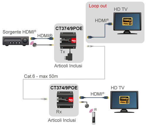ALPHA ELETTRONICA SR - ALPCT374/9POE EXT.HDMI POE 1XCAT6 50M IR-LOOPOUT-EDID - CT374/9POE