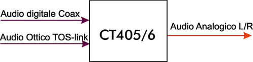 Il convertitore CT405/6 permette di convertire il segnale audio digitale in un segnale audio analogico.** Specifiche **- Converte audio Coax o TOSLINK in Audio L/R- Supporta velocità di campionamento di 32, 44.1, 48 e 96kHz.- Supporta risoluzione fino a 24bit- Installazione plug-n-play** Caratteristiche **Tipologia: ConvertitoreIngresso: 1 Audio COAX|TosLink®Uscita: 1 Audio L/RCompatibile 3D: noCompatibile 4K: noInstallazione: Plug-and-playInterfaccia di controllo: Nessuna** Caratteristiche Elettriche **Tipo Alimentazione: AlimentatoreIndicatore/i led di stato: Si** Contenuto confezione **1x Convertitore1x Alimentatore 5Vdc 1A - Spina DC ø5.5x2.1mm positivo centrale