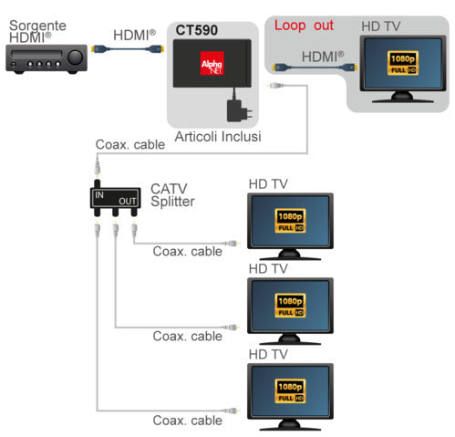 Il modulatore HDMI® DVB-T CT590 permette di distribuire il segnale HDMI® a più televisori tramite il normale cavo d'antenna e sfruttando il ricevitore digitale terrestre già presente all'interno dei TV. E' la soluzione ideale per uso domestico e show rooms, e dove è necessario distribuire il segnale ad un gran numero di TV contemporaneamente.** Specifiche **- Modulatore HDMI® DVB-T- Canale radio impostabile- Canale digitale impostabile- Parametri modulazione impostabili- Frequenza da 100 a 1000MHz- Bit rate: 31.6MBit- Encoding video: H264- Encoding audio: MPEG2- HDMI® 1.3 - HDCP 2.2- Risoluzioni supportate:480i@60Hz, 480p@60Hz, 576i@50Hz, 576p@50Hz, 720p@50/60Hz, 1080i@50/60Hz, 1080p@50/60Hz** Connessioni **Trasmettitore- Connettore HDMI® (Ingresso)- Connettore HDMI® (Uscita loop out)- Connettore tipo F (uscita RF)- Connettore tipo F (ingresso RF)- Connettore USB per aggiornamento firmware** Caratteristiche **Ingresso: HDMI®|RFUscita: RFCompatibile 3D: noCompatibile 4K: noRisoluzione massima: Full HD @ 60HzRisoluzioni supportate: 480i @ 60Hz, 480p @ 60Hz, 576i @ 50Hz, 576p @ 50Hz, 720p @ 50Hz, 720p @ 60Hz, 1080i @ 50Hz, 1080i @ 60Hz, 1080p @ 50Hz, 1080p @ 60HzFunzioni aggiuntive: Loop-Out** Attenzione **- Installazione plug and play, nessun driver o software richiesto** Contenuto confezione **1x Modulatore1x Alimentatori 12Vdc 1A (conn. 5,5-2,1mm positivo centrale)