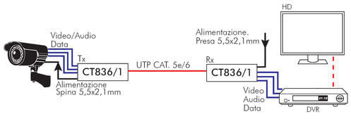 Il balun passivo CT836/1 è un convertitore per la trasmisione del segnale video, del segnale dati di controllo e dell'alimentazione su cavo twistato Cat5 o superiore per applicazioni TVCC. L'utilizzo di due dispositivi (trasmettitore e ricevitore) consente la trasmissione del segnale video, dati di controllo e dell'alimentazione senza necessità di alimentazione esterna.Esso dispone da un lato di un cavetto con connettore BNC per il collegamento del dispositivo video (telecamera e monitor), un cavetto libero per il collegamento del segnale di controllo del dispositivo video (telecamera e DVR) e un cavetto con connettore di alimentazione DC (5,5x2,1mm)Dall'altro lato dispone di una presa RJ45 che permette di collegare un cavo Cat5.Per la corretta installazione del prodotto, collegare il dispositivo con la spina DC al trasmettitore (lato telecamera) e il dispositivo con la presa DC al ricevitore (DVR).** Caratteristiche elettriche **Adatto per: Telecamere CCTV, Monitor, DVRFormato Video: PAL, NTSC, SECAM, AHD, HD-CVI, HD-TVIDistanza trasmissione: vedi tabellaCavo consigliato: UTP Cat5 o superiore 24-22AWGTrasmissione alimentazione: max 24Vac/dcDistanza alimentazione: in base alla caduta sul cavo Cat5Alimentazione: Non richiestaReiezione modo comune/modo differenziale: 60dB typ (15KHz-42MHz)Impedenza: Coassiale 75ohm, UTP 100ohmAttenuazione: 1.5 dB typ Max** Connettori **Video: BNC maschioPower: Spina e Presa 5,5x2,1mmData: fili liberiCavo Cat5: RJ45** Protezioni **Sovratensione: Stato solido TVS (Transient Voltage Suppressor)Video Input: 2KV (modo comune)Video Output: 2KV (modo differenziale)** Caratteristiche meccaniche **Corpo: plasticoProtezione: IP20Colore: NeroDimensioni(LxWxH): 65x36x25mmTemperatura di lavoro: -10º ~ 40ºCAttenzione:Non utilizzare in ambienti esterni.