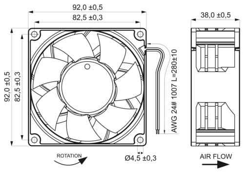 ** Caratteristiche Generali **Velocità di rotazione: 6500RPMFlusso aria: 3.95, (139.4)Pressione statica: 26.8, (1.06)Rumorosità: 63dBCuscinetti: A sferaTipo ventola: AssialeSensore di arresto: Si** Caratteristiche Elettriche **Tipo tensione: DCCorrente nominale: 1.2APotenza: 28.8W** Caratteristiche Meccaniche **Dimensioni (LxWxH): 92 x 92 x 38mmMateriale girante: PBTMateriale contenitore: PBTColore: NeroConduttori: 2 filiConnessioni: cavi liberi** Caratteristiche Termiche **Grado di infiammabilità: 94V-0Temperatura di lavoro: -25/70°CTemperatura di stoccaggio: -40/75°C