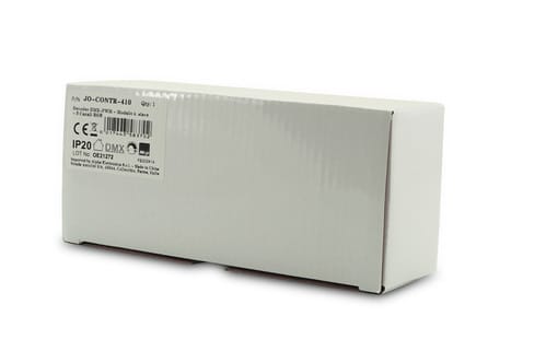 ** Caratteristiche **Controller Ricevitore DMX, permette di decodificare i segnali DMX e pilotare tramite PWM nastri Led e altre sorgenti luminose a bassa tensione dimmerabili.Il JO-CONTR-410 ha due modalità di funzionamento, selezionabili tramite il DIP Switch 10 "FUN":** - Opzione 1, Decoder - DIP switch 10 "FUN"impostato su OFF (0) **La centralina può essere utilizzata come decoder DMX-PWM. Il controllo colori, intensità, effetti è demandato alla centralina Master DMX (ad esempio JO-CONTR-420).Tramite gli appositi DIP switch è possibile impostare l'indirizzo di Base scegliendolo tra i 512 indirizzi del protocollo DMX.La centralina decodificherà i canali come da seguente schema:- uscita CH1/R: canale DMX Base+0;- uscita CH2/G: canale DMX Base+1;- uscita CH3/B: canale DMX Base+2.** - Opzione 2, Stand Alone - DIP switch 10 "FUN"impostato su ON (1) **La centralina può essere utilizzata in modalità controller RGB PWM indipendente dal controllo DMX. In questo caso con la centralina è possibile realizzare i seguenti effetti: colori statici e dinamici. I programmi memorizzati sono quelli riportati in tabella.** Dati Tecnici **Tensione d’Ingresso: 5/12/24VdcUscita: 3 canali PWM - Tensione come ingressoTipo uscita: morsettiCorrente: 4A per canalePotenza:12V x 4A x 3Ch = 144W24V x 4A x 3Ch = 288WMetodo di connessione: Anodo Comune (+ comune)Metodo di controllo: input DMX o Stand-AloneModi di funzionamento: 9 (7 statici e 2 dinamici)Temp. di Funzionamento: -10°C a 40°CDimensioni: 165x68x40mmConnettori DMX:n. 2 XLR 3 poli (entra-esci)n. 2 RJ45 8 poli (entra-esci)** Caratteristiche Generali **Funzione: ControllerAdatto per: RGBMetodo di controllo: DMX** Caratteristiche Elettriche **Tipo regolazione: Tensione costante (CV)Tensione d'ingresso: 5/12/24VTensione d'uscita: come ingressoTipo di uscita: morsettiMetodo di connessione: anodo comuneCorrente/Ch: 4An. canali: 3Potenza nominale (12V): 144WPotenza nominale (24V): 288W** Caratteristiche Meccaniche **Lunghezza: 68mmLarghezza: 165mmAltezza: 40mmGrado di protezione: IP20Materiale corpo: Alluminio verniciatoColore corpo: Nero** Caratteristiche Termiche **Temp. di funzionamento: -10 / 40°C** Modi di funzionamento **1 ON Rosso fisso intensità non regolabile2 ON Verde fisso intensità non regolabile3 ON Blu fisso intensità non regolabile4 ON Giallo fisso intensità non regolabile5 ON Viola fisso intensità non regolabile6 ON Ciano fisso intensità non regolabile7 ON Bianco fisso intensità nonregolabile8 ON Rotazione 3 colori9 ON Rotazione 7 colori (RGBYPCW) velocità regolabileModo 8 - velocità regolabile tramite switch 1-7 (strobo-velocità crescente-feeder)Modo 9 - velocità regolabile tramite switch 1-7 (strobo-velocità crescente-feeder)