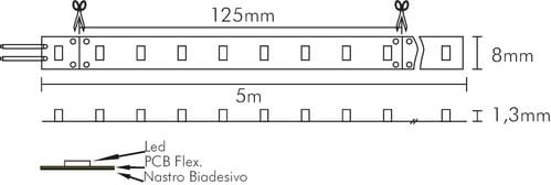 ** Caratteristiche Generali ** Applicazione: Per illuminazione Tempo di vita L70B50: 20000h Numero cicli di accensione: 10000 cicli Fattore di sopravvivenza: 0.9 Tipo nastro: Monocolore Colore Supporto: Bianco Tipo di led: smd 2835 0.2W n. Led al metro: 64 led/m Lunghezza max in cascata: 5m Rischio fotobiologico: Esente ** Caratteristiche di Illuminazione ** Colore: Bianco caldo Flusso Nastro Led: 500lm/m Flusso @ 50cm: 250lm CRI: 90 Angolo di emissione: 120° Warm-up (60%): 0.1s Fattore mantenimento flusso: 0.96 Uniformità colore (SDCM): 6 ** Caratteristiche Elettriche ** Classe energetica: F Potenza Nastro Led: 4.8W/m Potenza 50cm: 2.4W Potenza unità minima: 0.6W Tens. funzionamento DC: 24Vdc Dimmerabile: si Alimentatore: Esterno (non incluso) ** Caratteristiche Sorgente Luminosa ** Temp. Colore: 2700K ** Caratteristiche Meccaniche ** Lunghezza nastro: 5m N. Led/taglio: 8 Lunghezza taglio minima: 125mm Larghezza: 5000mm Spessore: 1.3mm Altezza: 8mm Fissaggio: Biadesivo 3M Grado di protezione: IP20 Tipo di protezione: Nessuno Connessioni: Cavo libero ** Caratteristiche Termiche ** Temp. di funzionamento: -10 / 40°C