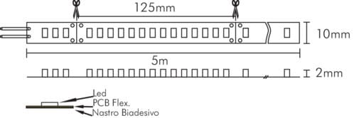 ** Caratteristiche Generali ** Tempo di vita L70B50: 20000h Numero cicli di accensione: 10000 cicli Fattore di sopravvivenza: 0.95 Tipo nastro: Monocolore Colore Supporto: Bianco Tipo di led: smd 2835 1W n. Led al metro: 112 led/m Lunghezza max in cascata: 5m Rischio fotobiologico: Esente ** Caratteristiche di Illuminazione ** Colore: Bianco naturale Flusso Nastro Led: 3400lm/m Flusso @ 50cm: 1700lm CRI: 80 Warm-up (60%): 0.1s Fattore mantenimento flusso: 0.96 Uniformità colore (SDCM): 6 ** Caratteristiche Elettriche ** Classe energetica: C Potenza Nastro Led: 19.2W/m Potenza 50cm: 9.6W Potenza unità minima: 2.4W Tens. funzionamento DC: 24Vdc Dimmerabile: si Alimentatore: Esterno (non incluso) ** Caratteristiche Sorgente Luminosa ** Temp. Colore: 4000K ** Caratteristiche Meccaniche ** Lunghezza nastro: 5m Lunghezza taglio minima: 125mm Larghezza: 10mm Altezza: 2mm Fissaggio: Biadesivo 3M Grado di protezione: IP20 Tipo di protezione: Nessuno Connessioni: Cavo libero ** Caratteristiche Termiche ** Temp. di funzionamento: -10 / 40°C
