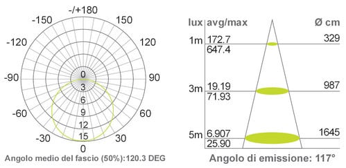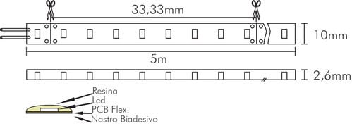 ** Caratteristiche Generali ** Applicazione: Per illuminazione Tempo di vita L70B50: 20000h Numero cicli di accensione: 10000 cicli Fattore di sopravvivenza: 0.9 Tipo nastro: Monocolore Colore Supporto: Bianco Tipo di led: smd 2835 0.2W n. Led al metro: 240 led/m Lunghezza max in cascata: 5m Rischio fotobiologico: Esente ** Caratteristiche di Illuminazione ** Colore: Bianco freddo Flusso Nastro Led: 2200lm/m Flusso @ 50cm: 1099lm CRI: 90 Angolo di emissione: 120° Warm-up (60%): 0.1s Fattore mantenimentoflusso: 0.96 Uniformità colore (SDCM): 6 ** Caratteristiche Elettriche ** Classe energetica: F Potenza Nastro Led: 19.2W/m Potenza 50cm: 9.6W Potenza unità minima: 0.639936W Tens. funzionamento DC: 24Vdc Dimmerabile: si Alimentatore: Esterno (non incluso) ** Caratteristiche Sorgente Luminosa ** Temp. Colore: 6000K ** Caratteristiche Meccaniche ** Lunghezza nastro: 5m N. Led/taglio: 8 Lunghezza taglio minima: 33.33mm Larghezza: 5000mm Spessore: 2.6mm Altezza: 10mm Fissaggio: Biadesivo 3M Grado di protezione: IP65 Tipo di protezione: Resina Connessioni: Cavo libero ** Caratteristiche Termiche ** Temp. di funzionamento: -10 / 40°C