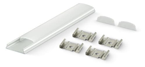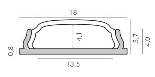 ** Caratteristiche generali ** Kit composto da: -n. 1 profilo di alluminio da 2m, -n. 1 copertura da 2m -n. 2 terminali di chiusura in plastica -n. 4 graffette di fissaggio ** Caratteristiche Elettriche ** Potenza dissipabile (35°C): 14W/m ** Caratteristiche Meccaniche ** Lunghezza profilo: 2m Larghezza: 18mm Larghezza interna: 13.5mm Altezza: 5.7mm Grado di protezione: IP20 Materiale corpo: Alluminio Colore corpo: Naturale Diffusore: Policarbonato opaco ** Attenzione ** Il profilo illustrato è un componente. Il suo corretto funzionamento con nastri led o moduli led dipende da importanti requisiti di installazione e dimensionamento. La potenza dissipabile è stata calcolata considerando una temperatura ambiente non superiore a 35°C in aria. Condizionidi installazione differenti devono essere opportunamente verificate da personale tecnico. Utilizzare la copertura solo con nastri led IP20. Alpha Elettronica declina ogni responsabilità per danni o malfunzionamenti derivati da un uso inappropriato del profilo. Il profilo illustrato non é compatibile con dimmer metal touch JO-CONTR-014. Il montaggio della copertura plastica deve essere effettuata a scorrimento. ** NOTE ** Attenzione che non vengono accettati resi o contestazioni per difettosità su prodotto piegato. Le attività di lavorazione sono a totale rischio del cliente. Non è un prodotto di gomma e quindi non è indicato modificarne la piegatura più volte. Fare in modo di ottenere il risultato finale con un’ unica azione di piegatura. Prima dell’acquisto di quantità è consigliato che il cliente verifichi sempre autonomamente la applicabilità affettiva dei raggi di curvatura a lui necessari. Fare attenzione che dopo una piegatura il prodotto non è riportabile alle condizioni di uniformità di linearità iniziali.