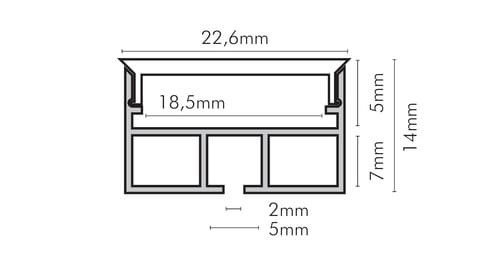 ** Caratteristiche generali **Composto da:-n. 1 profilo di alluminio da 2m,-n. 1 copertura da 2m** Caratteristiche Elettriche **Potenza dissipabile (35°C): 23W/m** Caratteristiche Meccaniche **Lunghezza profilo: 2mLarghezza: 22.6mmLarghezza interna: 18.5mmAltezza: 14mmPeso alluminio al metro: 210g/mPeso cover al metro: 35g/mGrado di protezione: IP20Materiale corpo: AlluminioColore corpo: NaturaleDiffusore: Policarbonato opaco** Attenzione **Il profilo illustrato è un componente. Il suo corretto funzionamento con nastri led o moduli led dipende da importanti requisiti di installazione e dimensionamento. La potenza dissipabile è stata calcolata considerando una temperatura ambiente non superiore a 35°C in aria. Condizioni di installazione differenti devono essere opportunamente verificate da personale tecnico. Utilizzare la copertura solo con nastri led IP20.Alpha Elettronica declina ogni responsabilità per danni o malfunzionamenti derivati da un uso inappropriato del profilo.Il profilo illustrato non é compatibile con dimmer metal touch JO-CONTR-014.Alpha Elettronica declina ogni responsabilità per danni o malfunzionamenti derivati da un uso inappropriato del profilo.Il montaggio della copertura plastica deve essere effettuata a scorrimento.
