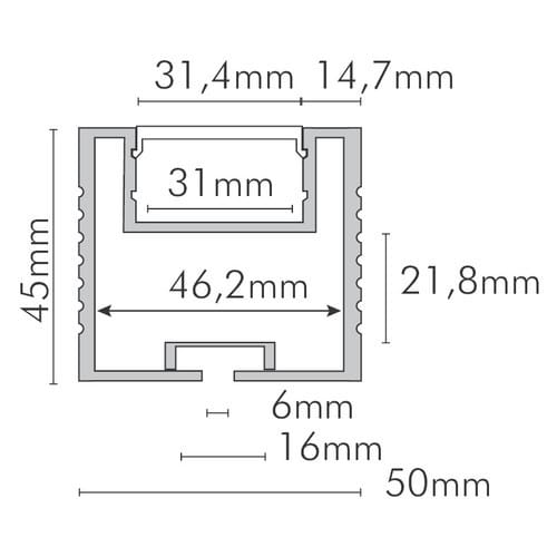 ** Caratteristiche generali **Composto da:-n. 1 profilo di alluminio da 2m,-n. 1 copertura da 2m** Caratteristiche Elettriche **Potenza dissipabile (35°C): 32W/m** Caratteristiche Meccaniche **Lunghezza profilo: 2mLarghezza: 50mmLarghezza interna: 31mmAltezza: 45mmGrado di protezione: IP20Materiale corpo: AlluminioColore corpo: NaturaleDiffusore: Policarbonato opaco** Attenzione **La copertura in Policarbonato (PC) è più sensibile alle temperature e ai raggi UV rispetto alla coperturain PMMA.Il profilo illustrato è un componente. Il suo corretto funzionamento con nastri led o moduli led dipende da importanti requisiti di installazione e dimensionamento. La potenza dissipabile è stata calcolata considerando una temperatura ambiente non superiore a 35°C in aria. Condizioni di installazione differenti devono essere opportunamente verificate da personale tecnico. Utilizzare la copertura solo con nastri led IP20.Alpha Elettronica declina ogni responsabilità per danni o malfunzionamentiderivati da un uso inappropriato del profilo.Il profilo illustrato non é compatibile con dimmer metal touch JO-CONTR-014.Il montaggio della copertura plastica deve essere effettuata a scorrimento.