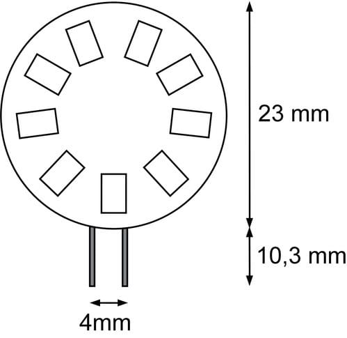 ** Caratteristiche Generali **Tempo di vita L70B50: 20000hNumero cicli di accensione: 10000 cicliFattore di sopravvivenza: 0.9Tipo di led: smd 2835Numero Led: 9Rischio fotobiologico: Esente** Caratteristiche di Illuminazione **Colore: Bianco caldoFlusso: 190lmCRI: 80Angolo di emissione: 120°Starting time: 0.2sFattore mantenimento flusso: 0.96Uniformità colore (SDCM): 6** Caratteristiche Elettriche **Classe energetica: EPotenza: 1.5WTens. funzionamento DC: 12Vdc (10‑30Vdc)Tens. funzionamento AC: 12Vac (8‑15Vac)Frequenza: 50-60HzDimmerabile: no** Caratteristiche Sorgente Luminosa **Temp. Colore: 3000K** Caratteristiche Meccaniche **Attacco: G4Lunghezza: 10mmLarghezza: 23mmAltezza: 35mmDiametro: ø23mm** Caratteristiche Termiche **Temp. di funzionamento: -10 / 40°C** Attenzione **Non utilizzare con dimmer o trasformatori elettronici.