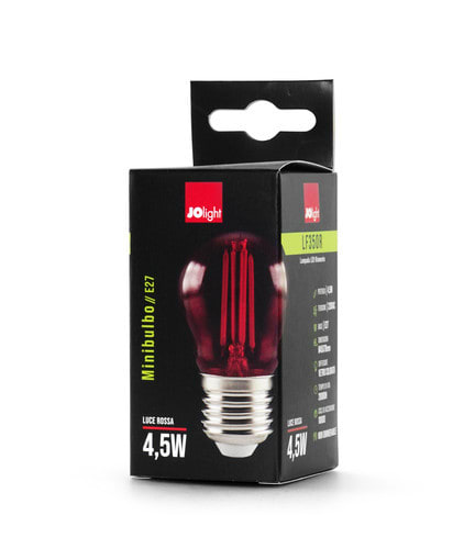 ** Caratteristiche Generali **Tipo lampada: Mini-BulboTempo di vita L70B50: 20000hNumero cicli di accensione: 10000 cicliTipo di led: FilamentoRischio fotobiologico: Esente** Caratteristiche di Illuminazione **Colore: RossoCRI: 80Angolo di emissione: 360°Starting time: 0.2s** Caratteristiche Elettriche **Potenza: 4.5WTens. funzionamento AC: 230VacTolleranza d'ingresso: ±10%Frequenza: 50-60HzDimmerabile: no** Caratteristiche Meccaniche **Attacco: E27Altezza: 80mmDiametro: ø45mmDiffusore: Vetro colorato** Caratteristiche Termiche **Temp. di funzionamento: -10 / 40°C